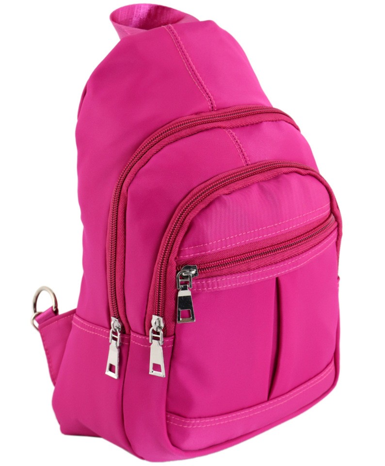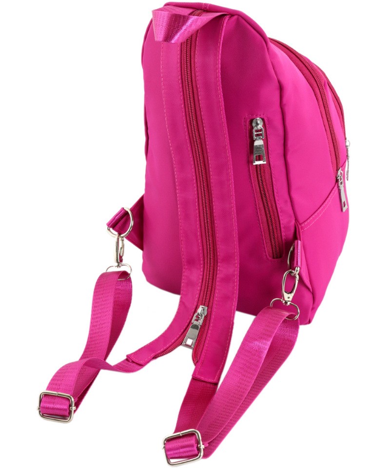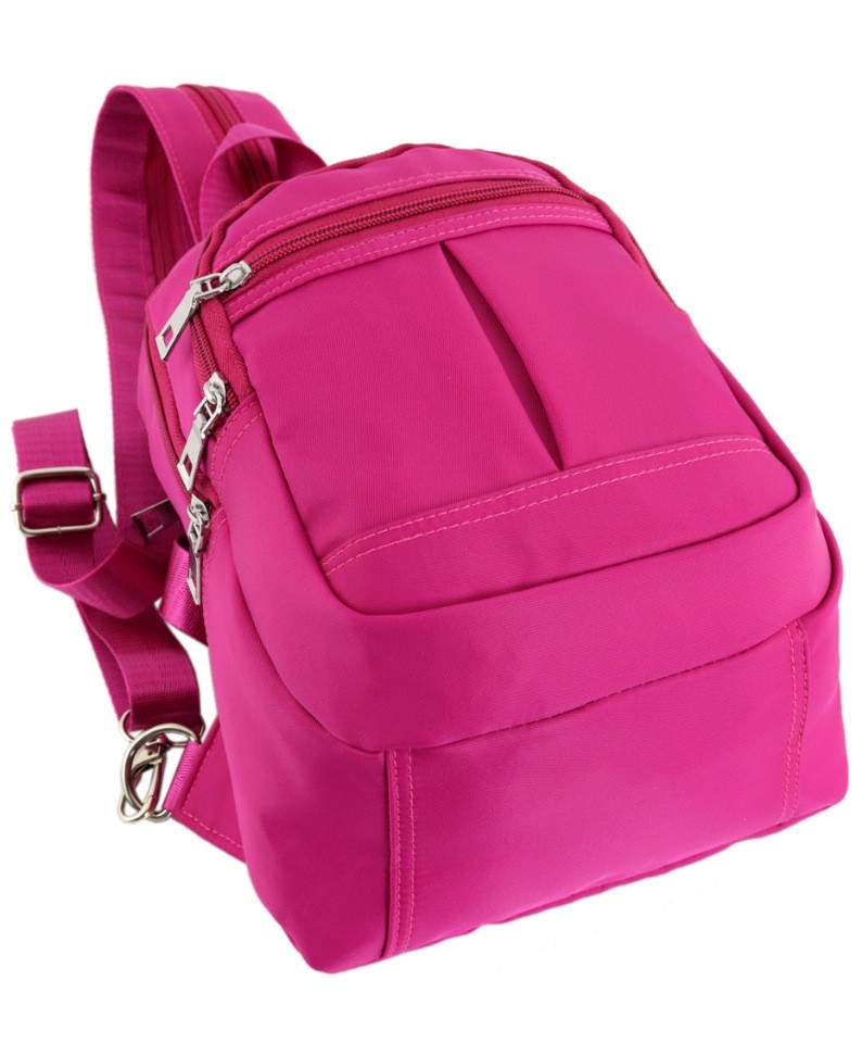 Рюкзак малинового цвета из плотного влагостойкого нейлона. Основное отделение на молнии, внутри кармашек. С внешней стороны 3 кармана на молнии. Уплотненная спинка, регулируемые плечевые ремни на карабинах, соединяются молнией.