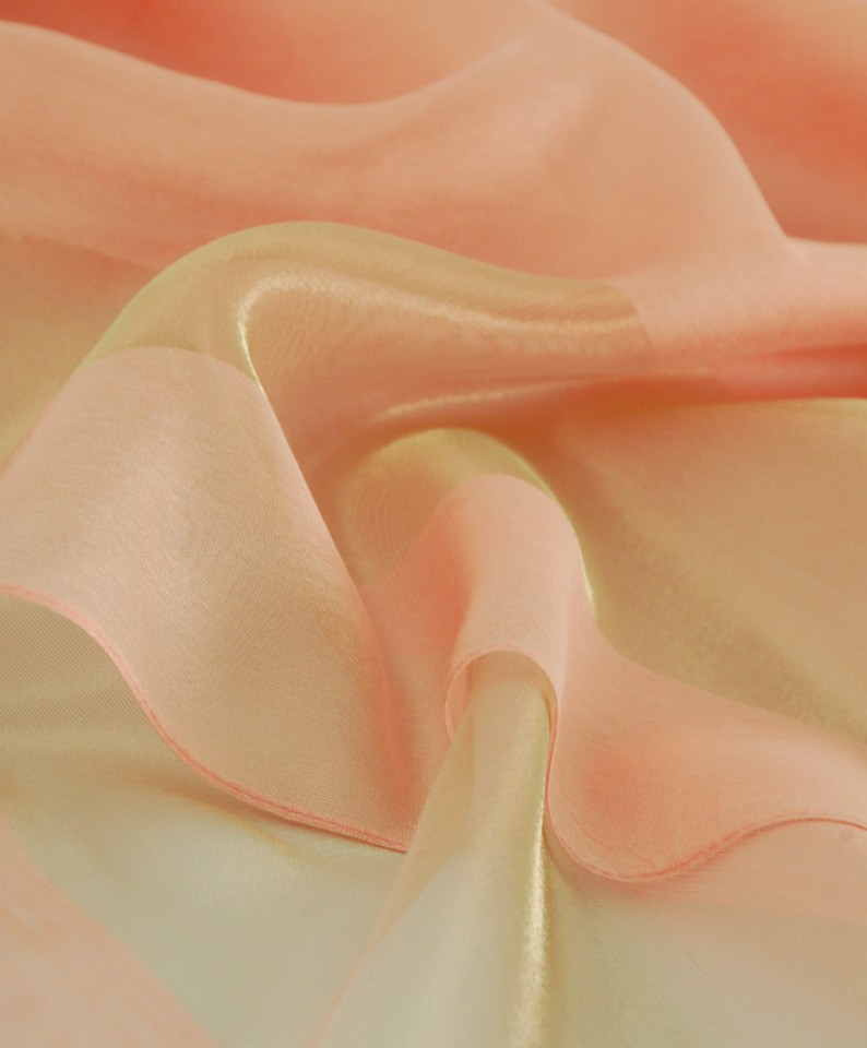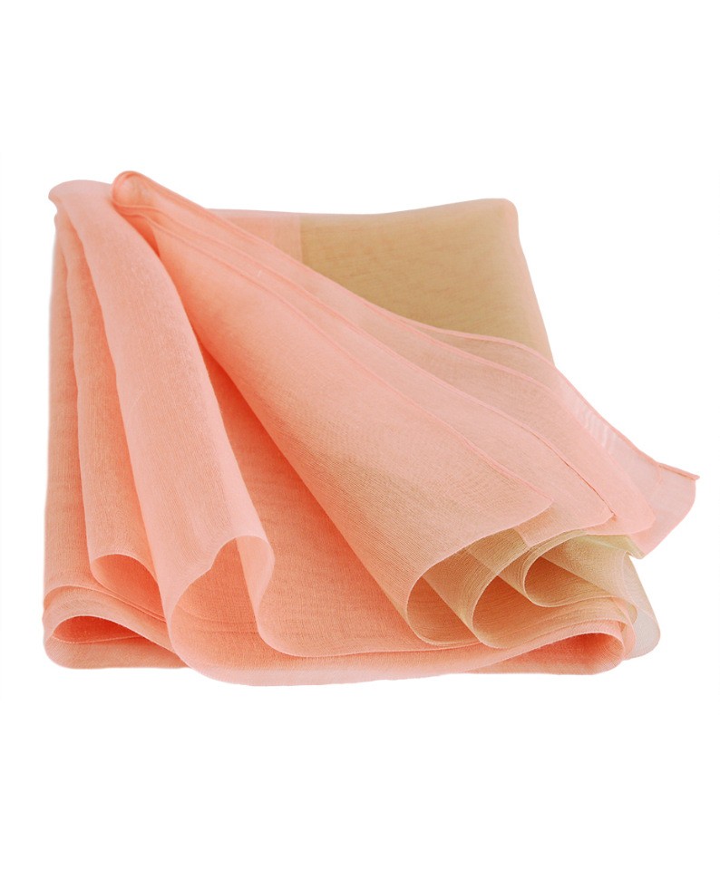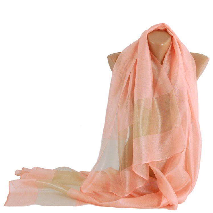 Легкий шелковый шарф персикового цвета с широкой полупрозрачной золотистой полосой.
