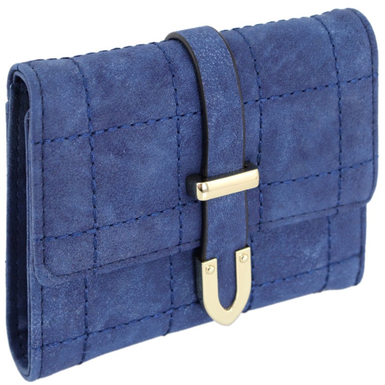 Кошелек из искусственного замша синего цвета, прострочен квадратами. Закрывается клапаном на кнопке, внутри: 2 отделения для купюр, 7- для пластиковых карт, 1- отделение с прозрачным окошком.