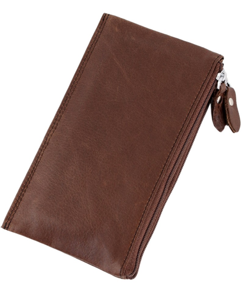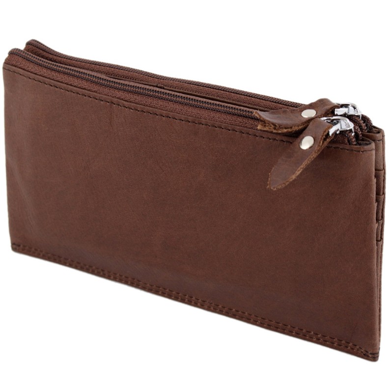 Кожаный кошелек темно-коричневого цвета, закрывается на кнопки. 2 отделения на молнии для купюр, 8 отделений для пластиковых карт, 1- с прозрачным окошком и монетница на молнии.