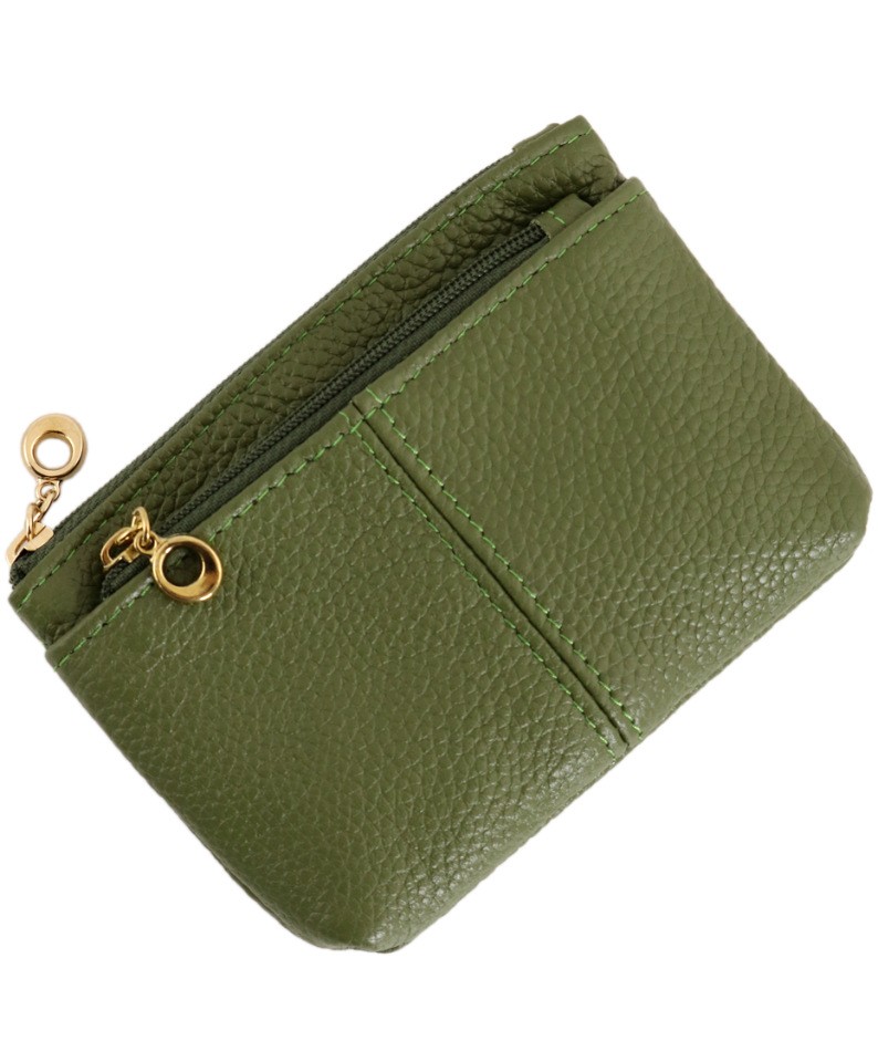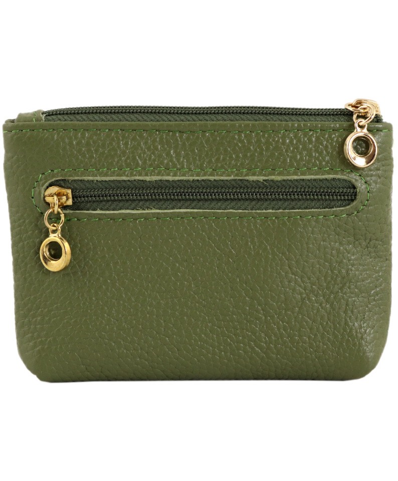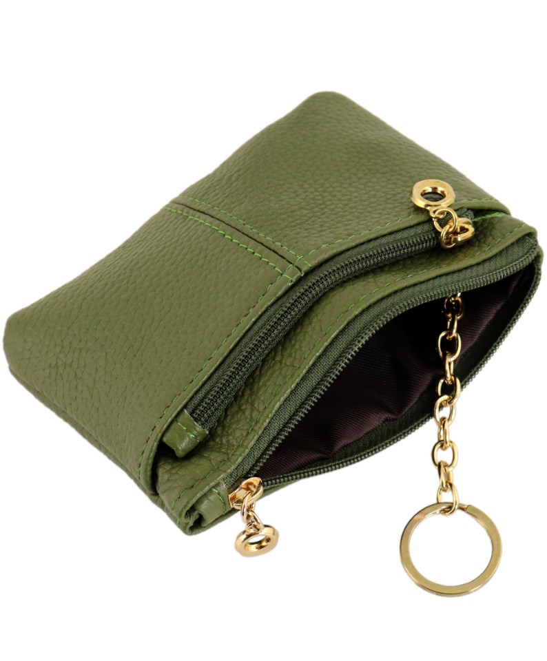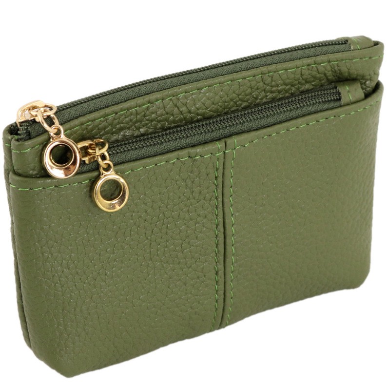 Кошелек зеленого цвета, на молнии. Внутри: кармашек и цепочка для ключей. С внешней стороны- 2 кармана на молнии.